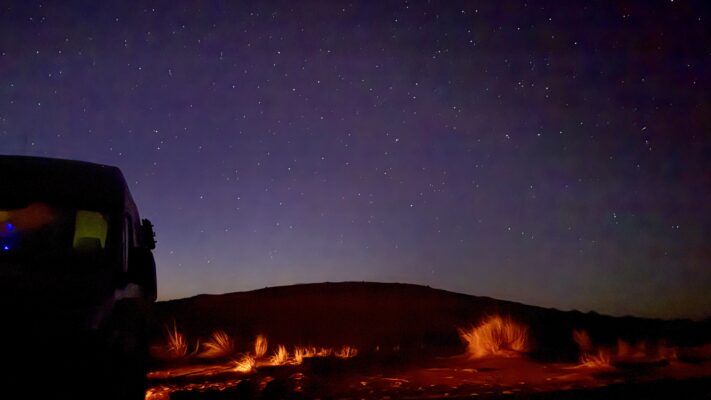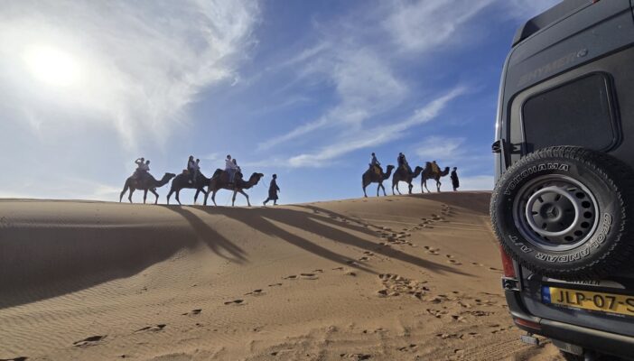 Dromedaris of the Desert, afgekort tot Dromi. Deze stoere bijnaam gaf gids Hamid onze Hymer Grand Canyon tijdens de 2-daagse off-road tour door de woestijn van Ouzina naar Zagora. Qua off-road ervaring zijn wij, Ali Baba en Fatima (bedankt Hamid voor deze bijnamen), beginners dus samen reizen met een lokale gids leek ons een goed idee. We kunnen dit iedereen aanraden! Fantastische routes dwars door de woestijn. Achter elke bocht een nieuw avontuur kreeg hier extra betekenis. Op een adembenemende plek maakten we zelf een heerlijke tajine, zaten we in het donker bij het vuur en sliepen we onder de sterren. Tijdens deze 2 dagen hebben we bovendien veel geleerd over onze bus én over off-road rijden. Dit was absoluut het hoogtepunt van onze reis. Heb je ook belangstelling voor deze ervaring? Stuur ons een berichtje voor de contactgegevens van Hamid.
