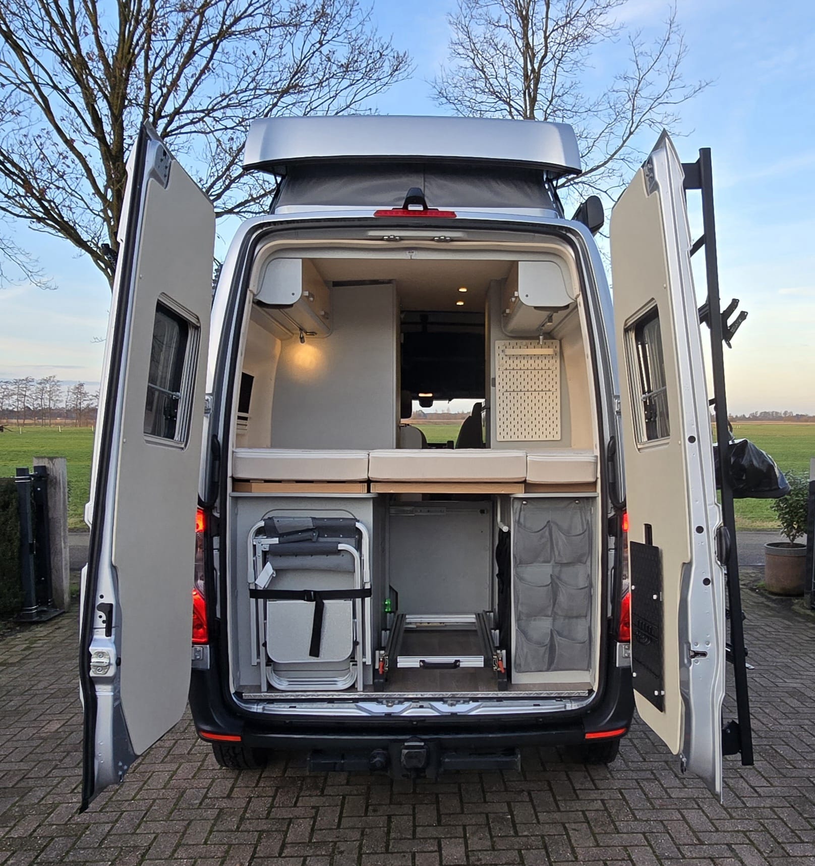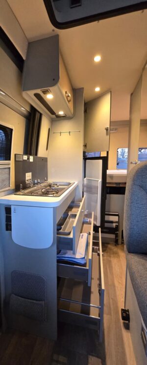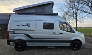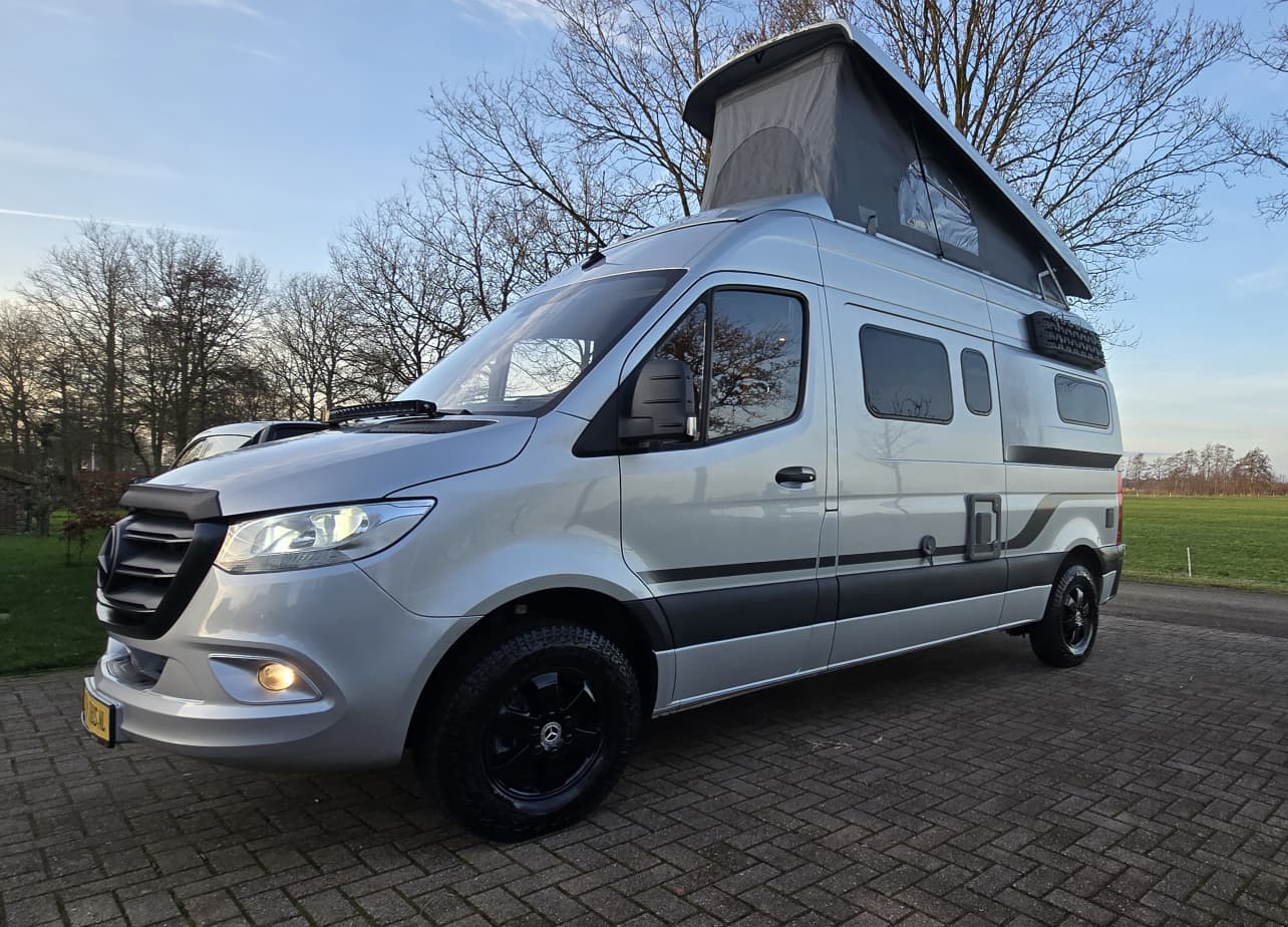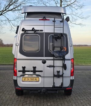 Uitgevoerd met heel veel extra’s die deze buscamper een unieke uitstraling geven. Wat dacht je van zandplaten, verstraler LED balk, buitentrap en handige uitschuifrail voor opbergboxen. Op de achterdeuren de mogelijkheid om 2 fietsen verticaal mee te nemen. Praktisch en stoer tegelijk! Deze Mercedes Sprinter biedt een stevige basis met 9G automaat en luchtvering op de achteras. Dankzij de 2 zonnepanelen én de 2 lithium boardaccu’s kun je zelfvoorzienend off-grid camperen. Nieuwsgierig? Maak dan een afspraak voor een vrijblijvende bezichtiging.