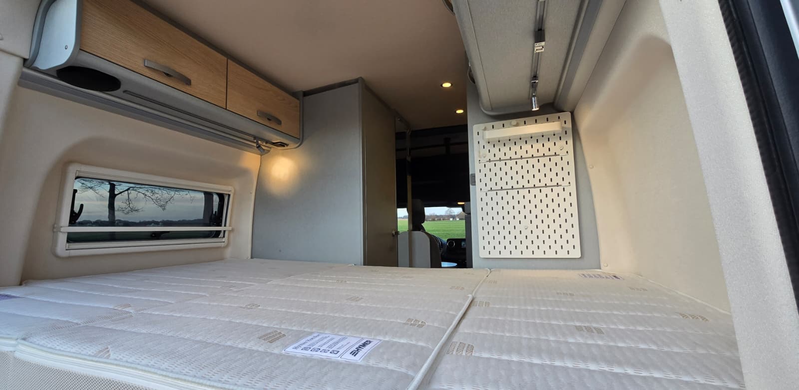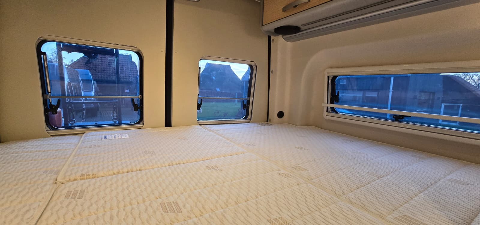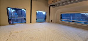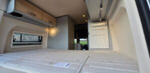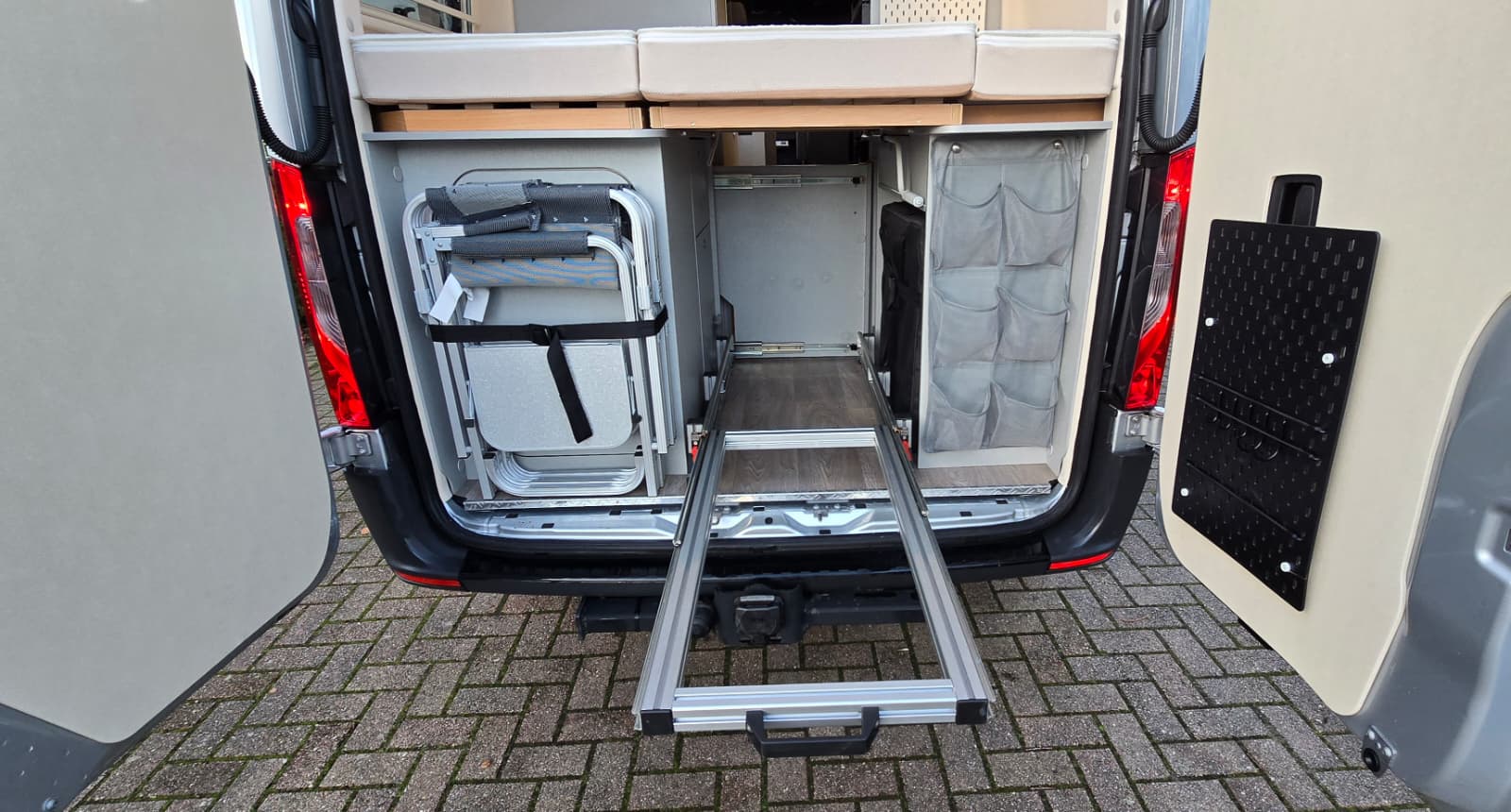 - Opbergruimte in de garage onder de bedden, bereikbaar vanuit het leefgedeelte dankzij het in delen opklapbare bed
