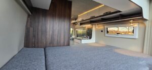- Vast bed achterin 140 (hoofdeind)/120 (voeteneind) x 195 cm